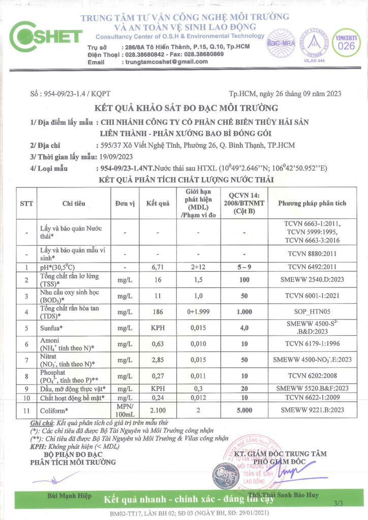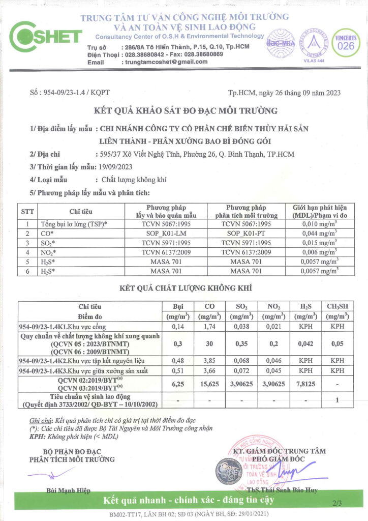 Bài trước Bài sau KẾT QUẢ KHẢO SÁT ĐO ĐẠC MÔI TRƯỜNG CHI NHÁNH CÔNG TY CỔ PHẦN CHẾ BIẾN THỦY HẢI SẢN LIÊN THÀNH- PHÂN XƯỞNG BAO BÌ lienthanh 13 October, 2023 9:01 pm Các tin tức liên quan Kết quả kiểm nghiệm môi trường không khí tại Phân xưởng 5 (9/2025) Xem thêm » 5 November, 2025 Kết quả kiểm nghiệm môi trường không khí tại Phân xưởng 4 (9/2025) Xem thêm » 5 November, 2025 Kết quả kiểm nghiệm môi trường không khí tại Phân xưởng Đóng gói Bao Bì (9/2025) Xem thêm » 5 November, 2025 Kết quả kiểm nghiệm nước theo thông tư 52/2024/TT-BYT của Phân xưởng 5 (9/2025) Xem thêm » 21 October, 2025 Kết quả thử nghiệm nước tại các bể chứa phục vụ sản xuất – Phân xưởng Đóng Gói Bao Bì (Tháng 9/2025) Xem thêm » 25 September, 2025 Biên bản lấy mẫu và đo kiểm nước sản xuất tại hiện trường – Phân xưởng Đóng Gói Bao Bì (Tháng 9/2025) Xem thêm » 25 September, 2025
