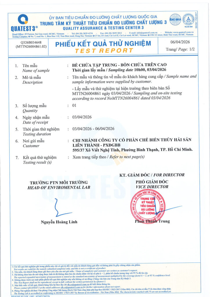 Kết quả thử nghiệm mẫu nước tại bể tập trung PX4 – 1/2026