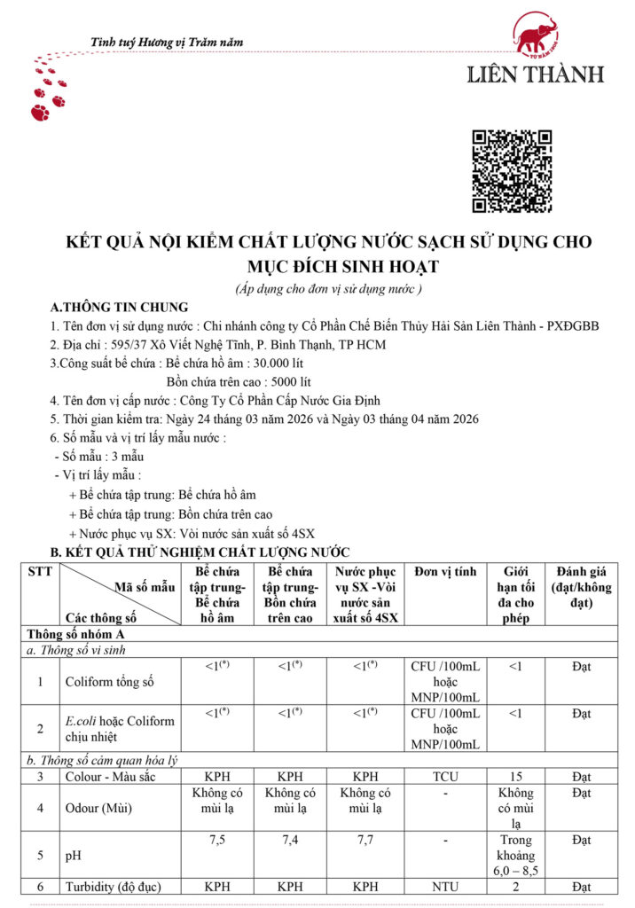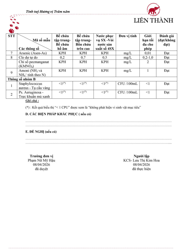 Kết quả nội kiểm chất lượng nước sạch sử dụng cho mục đích sinh hoạt (PXĐGBB – Tháng 4/2026)