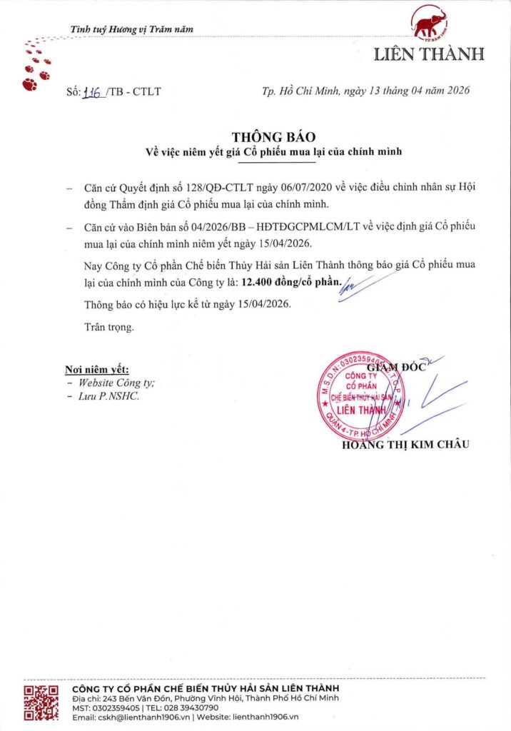 THÔNG BÁO VỀ VIỆC NIÊM YẾT GIÁ CỔ PHIẾU CỦA CÔNG TY CP CB.THS LIÊN THÀNH NGÀY 15/04/2020