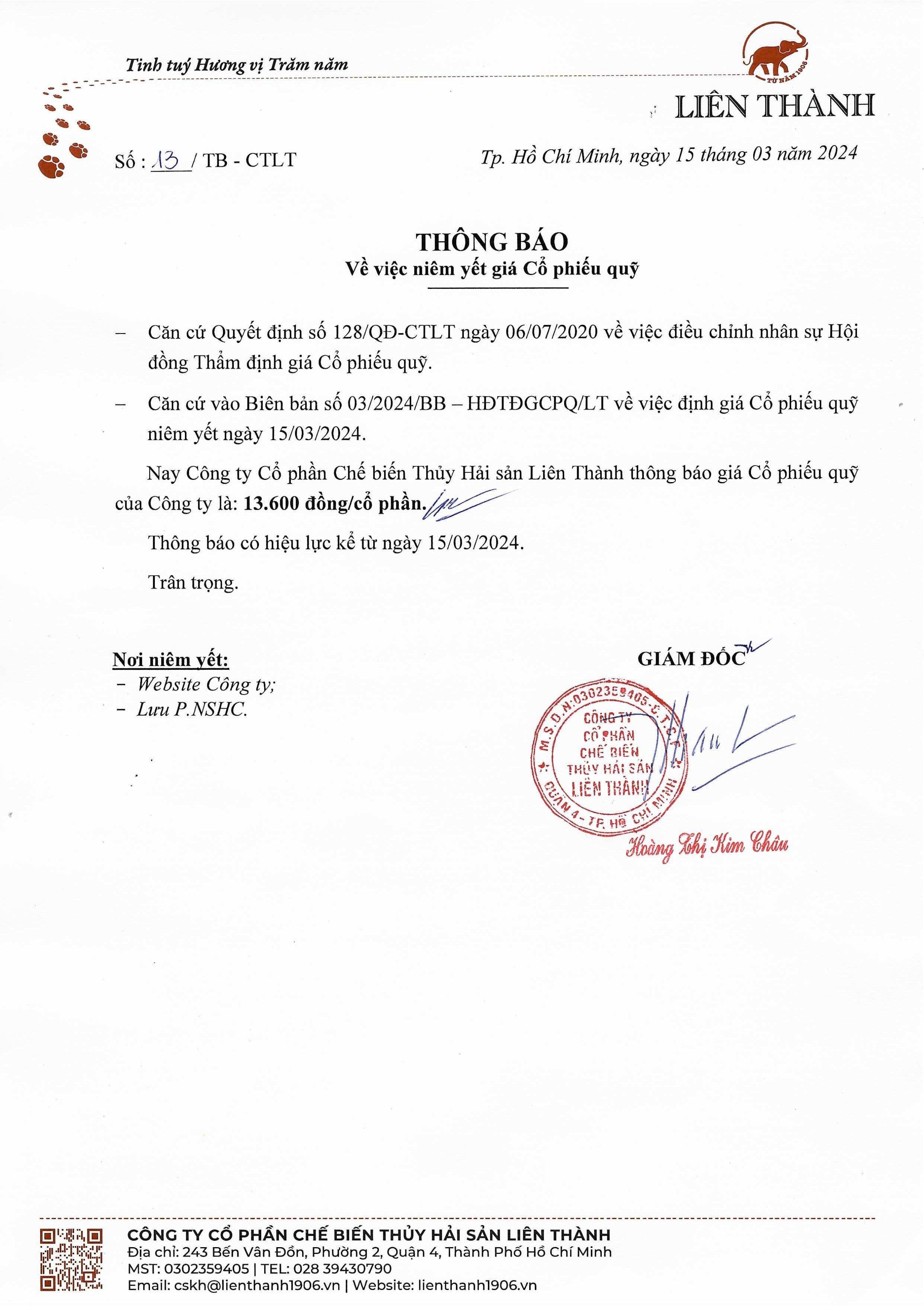 THÔNG BÁO VỀ VIỆC NIÊM YẾT GIÁ CỔ PHIẾU CỦA CÔNG TY CP CB.THS LIÊN THÀNH NGÀY 15/03/2024 16 March, 2024