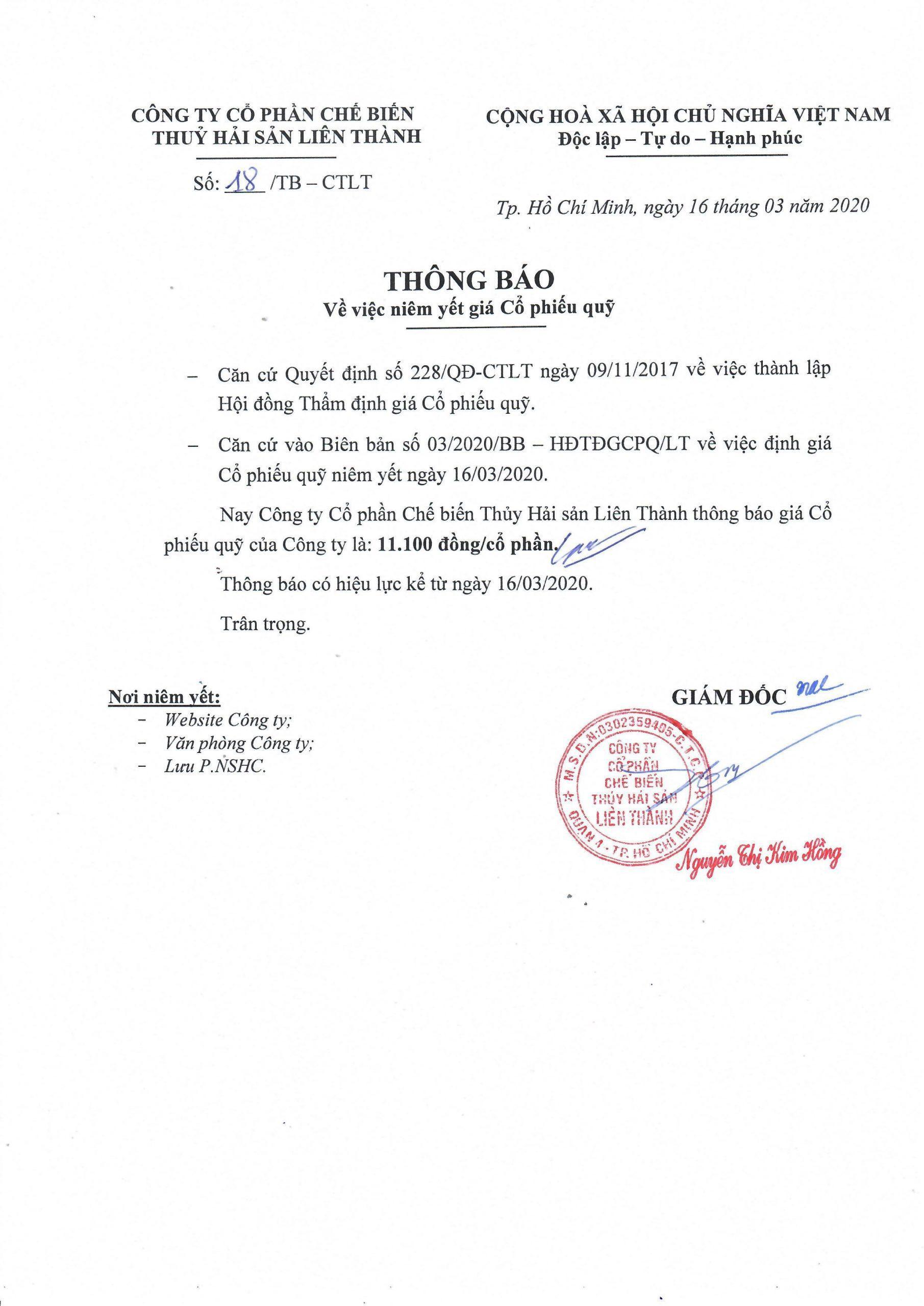 THÔNG BÁO VỀ VIỆC NIÊM YẾT GIÁ CỔ PHIẾU CỦA CÔNG TY CP CB.THS LIÊN THÀNH NGÀY 16/03/2020 23 September, 202323 June, 2021