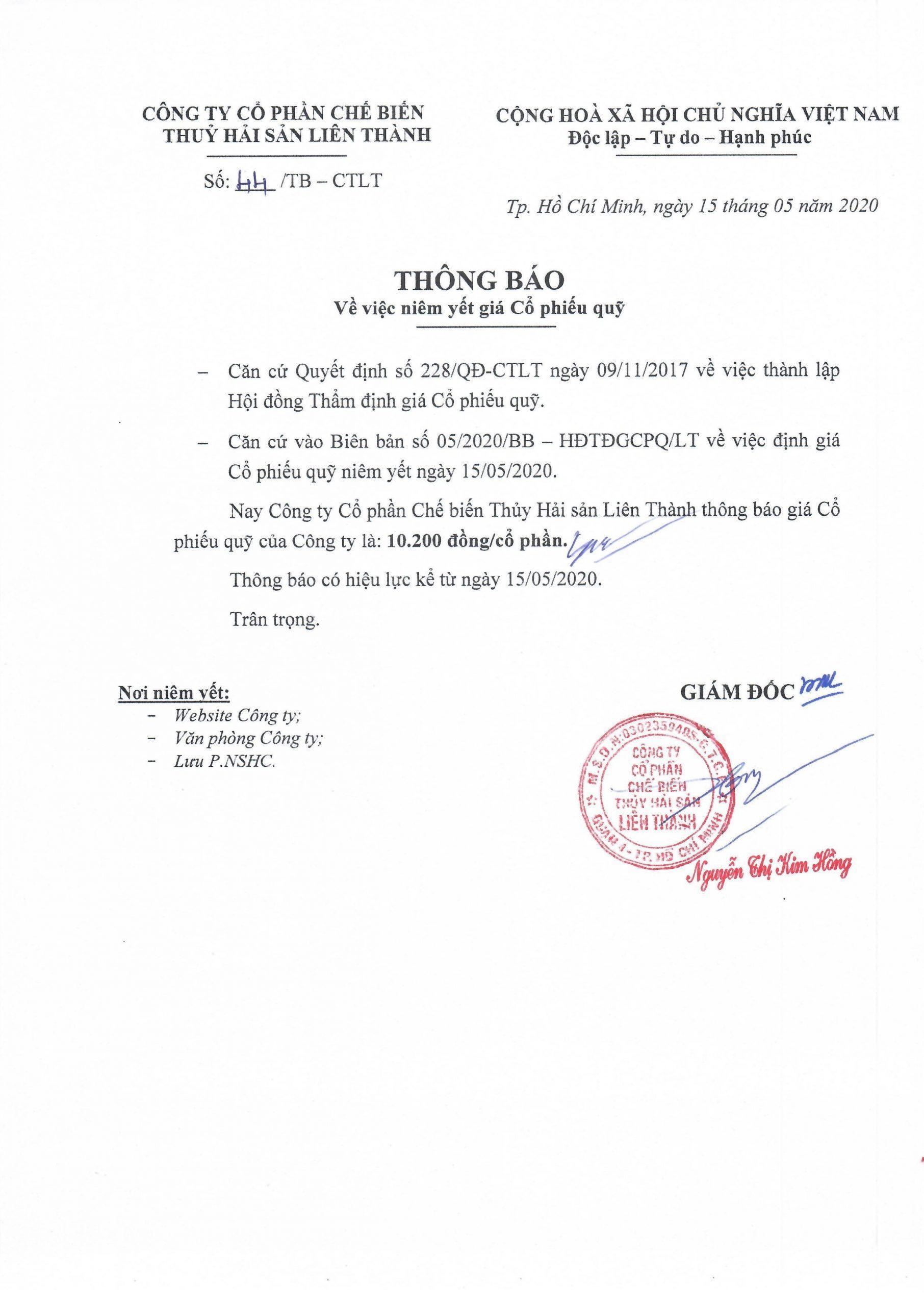 THÔNG BÁO VỀ VIỆC NIÊM YẾT GIÁ CỔ PHIẾU CỦA CÔNG TY CP CB.THS LIÊN THÀNH NGÀY 15/05/2020 23 September, 202323 June, 2021