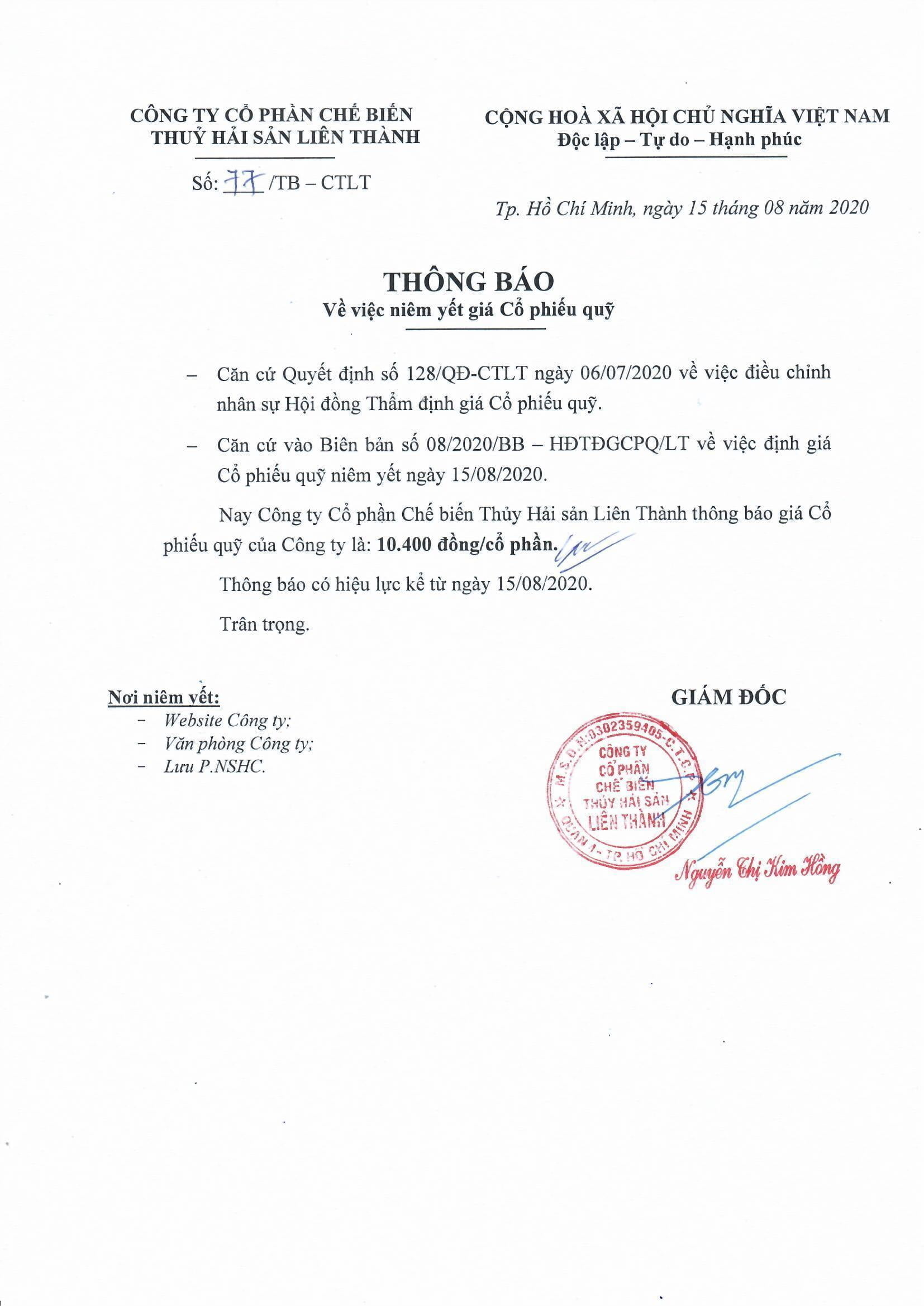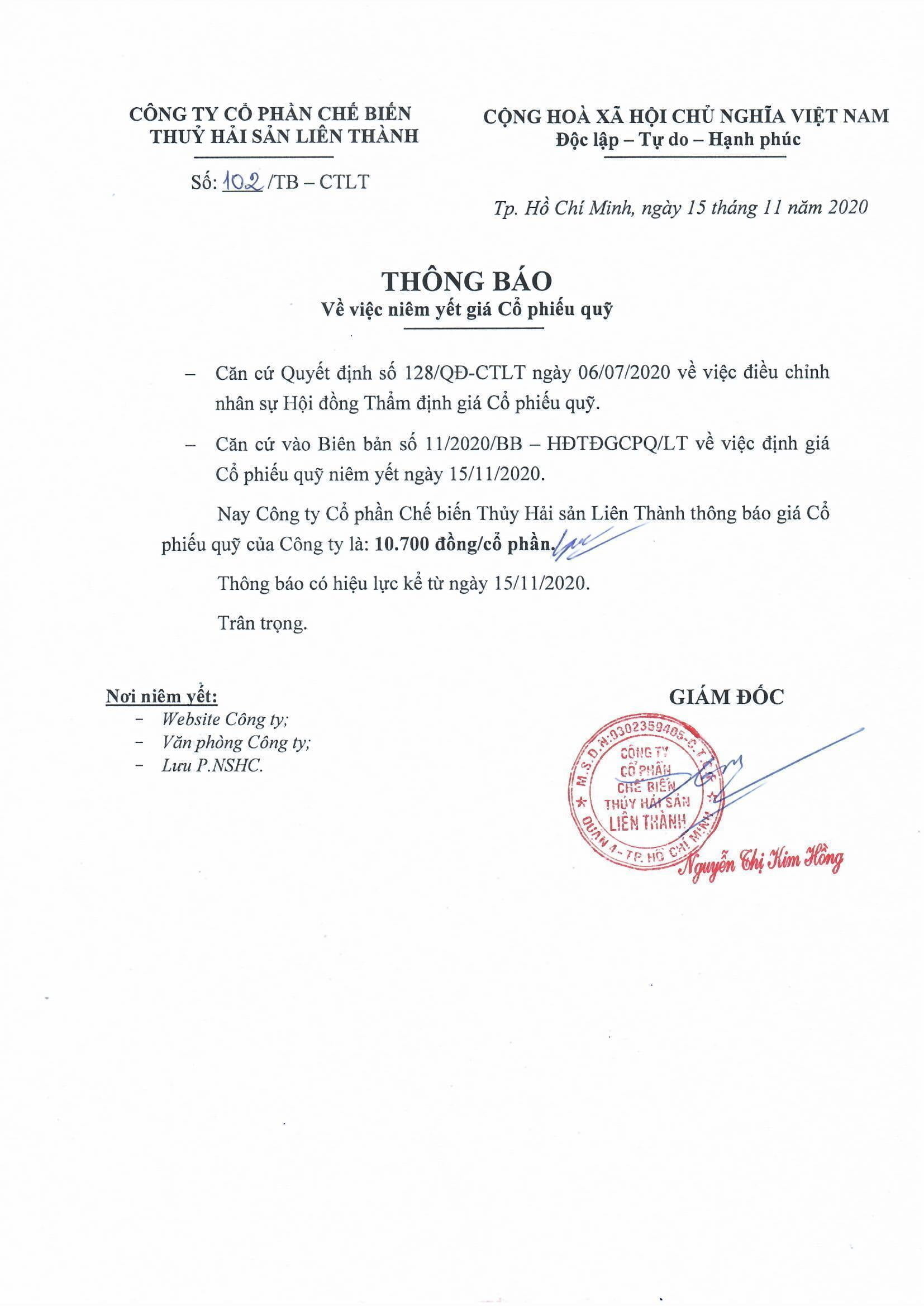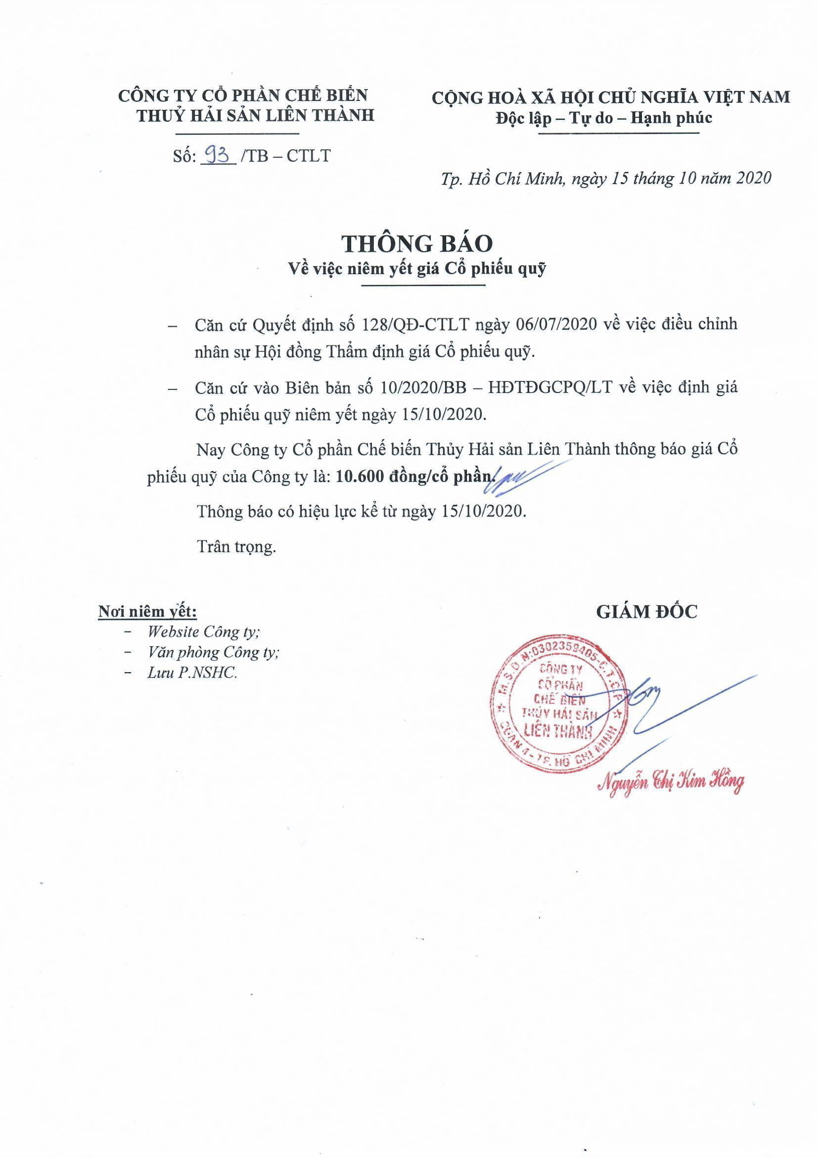 THÔNG BÁO VỀ VIỆC NIÊM YẾT GIÁ CỔ PHIẾU CỦA CÔNG TY CP CB.THS LIÊN THÀNH NGÀY 15/10/2020 23 September, 202323 June, 2021