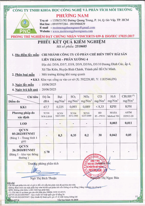 KẾT QUẢ KIỂM NGHIỆM MÔI TRƯỜNG KHÔNG KHÍ (THÁNG 6/2025) CHI NHÁNH CÔNG TY CỔ PHẦN CHẾ BIẾN THỦY HẢI SẢN LIÊN THÀNH – PHÂN XƯỞNG 4 11 September, 2025