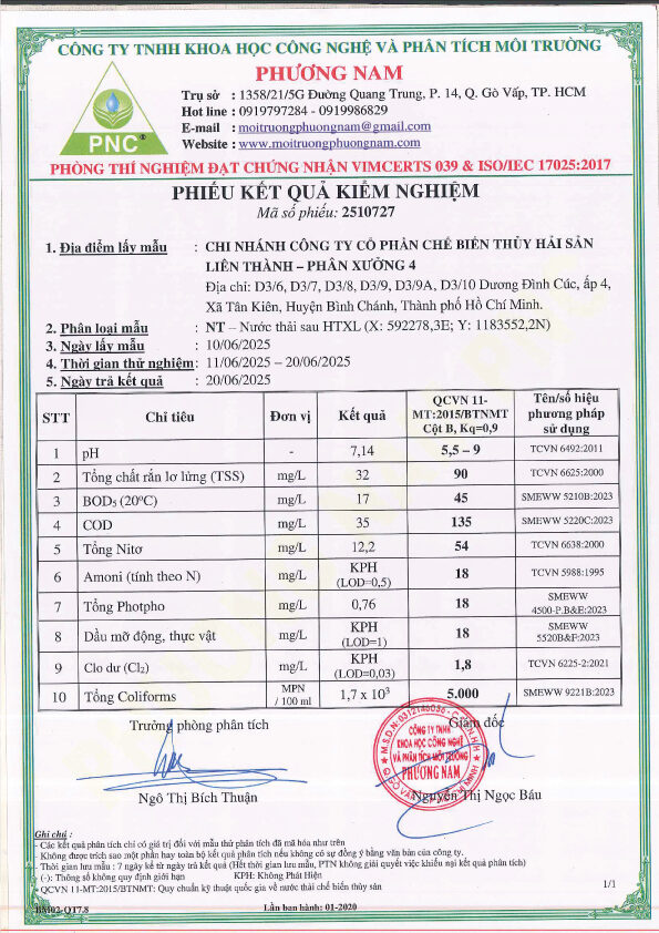 KẾT QUẢ KIỂM NGHIỆM NƯỚC THẢI (THÁNG 6/2025) CHI NHÁNH CÔNG TY CỔ PHẦN CHẾ BIẾN THỦY HẢI SẢN LIÊN THÀNH – PHÂN XƯỞNG 4 11 September, 2025