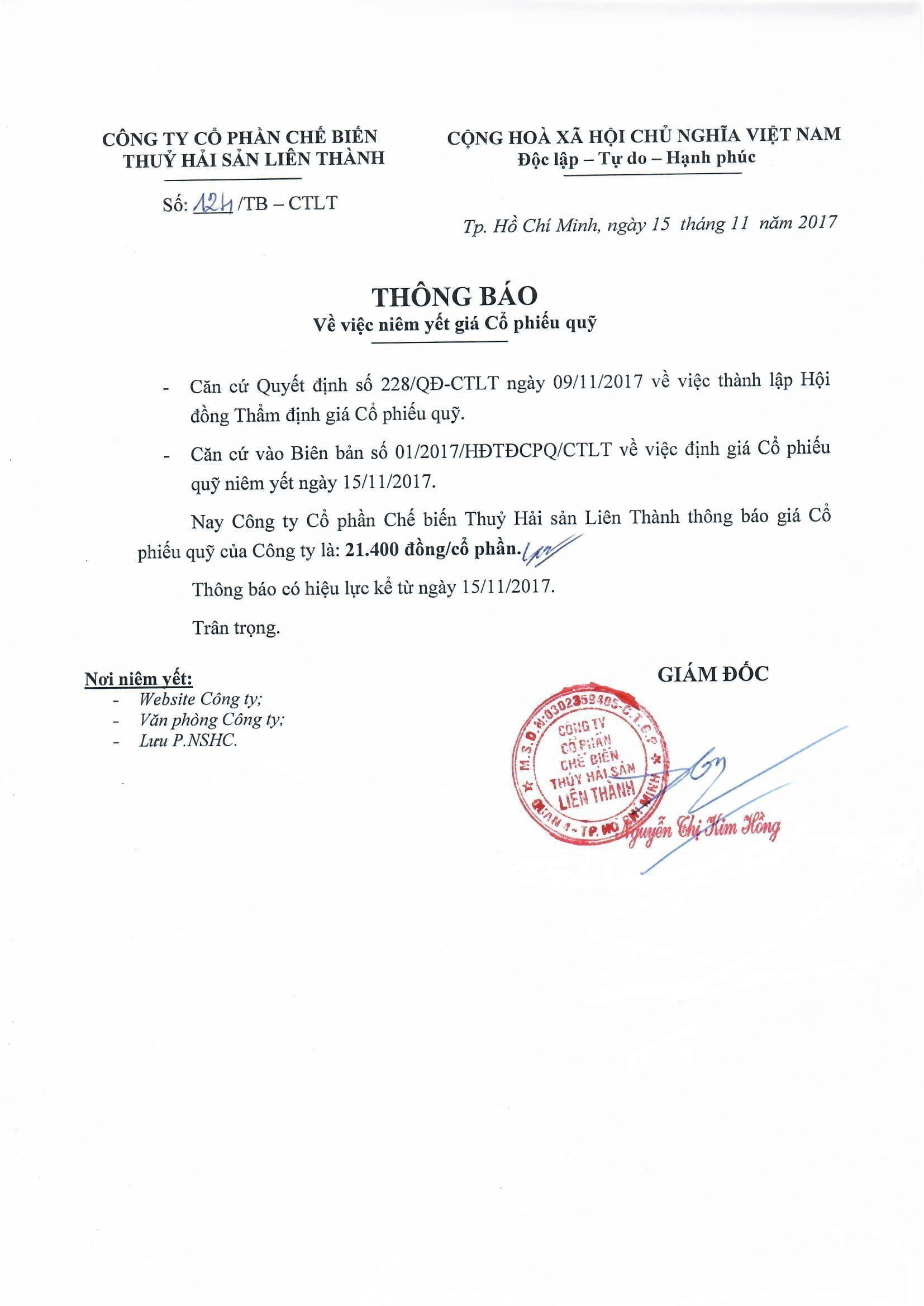 THÔNG BÁO VỀ VIỆC NIÊM YẾT GIÁ CỔ PHIẾU QŨY CỦA CÔNG TY CP CB.THS LIÊN THÀNH NGÀY 15/11/2017