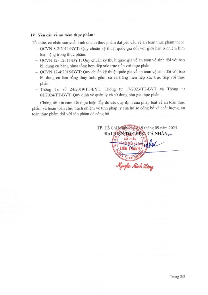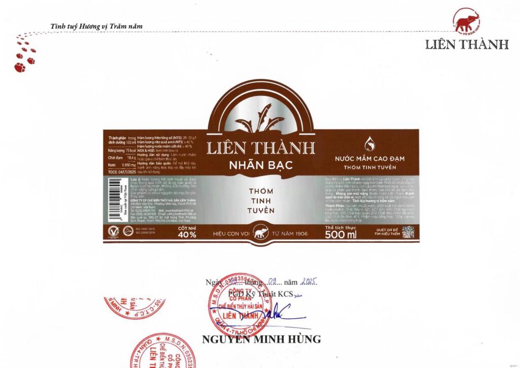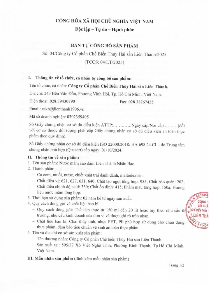 Bài trước Bài sau Bản tự công bố sản phẩm Nước Mắm Liên Thành Nhãn Bạc lienthanh 23 September, 2025 9:36 am Các tin tức liên quan Bản tự công bố sản phẩm Nước mắm Liên Thành Nhất Vị (11/2025) Xem thêm » 26 November, 2025 Bản tự công bố sản phẩm Nước mắm chay Liên Thành Hương Nấm (11/2025) Xem thêm » 26 November, 2025 Bản tự công bố sản phẩm Nước mắm Liên Thành Nhất Vị Xem thêm » 13 November, 2025 Thông báo cập nhật địa chỉ trên tự công bố và nhãn sản phẩm (11/2025) Xem thêm » 5 November, 2025 Thông báo cập nhật thông tin địa chỉ trên tự công bố và nhãn Nước mắm truyền thống Liên Thành Nhãn Đỏ Xem thêm » 13 October, 2025 Thông báo bổ sung thiết kế nhãn sản phẩm Nước mắm cao đạm Liên Thành Nhãn Ngọc Xem thêm » 13 October, 2025