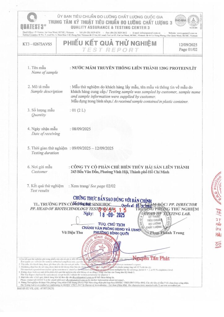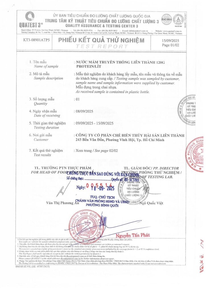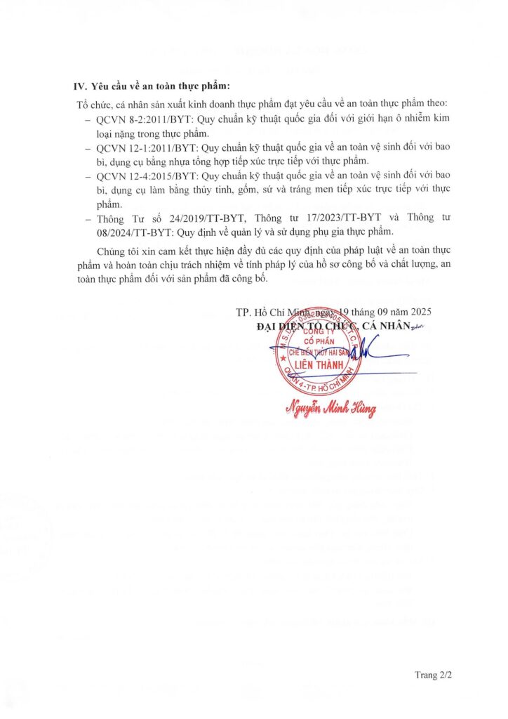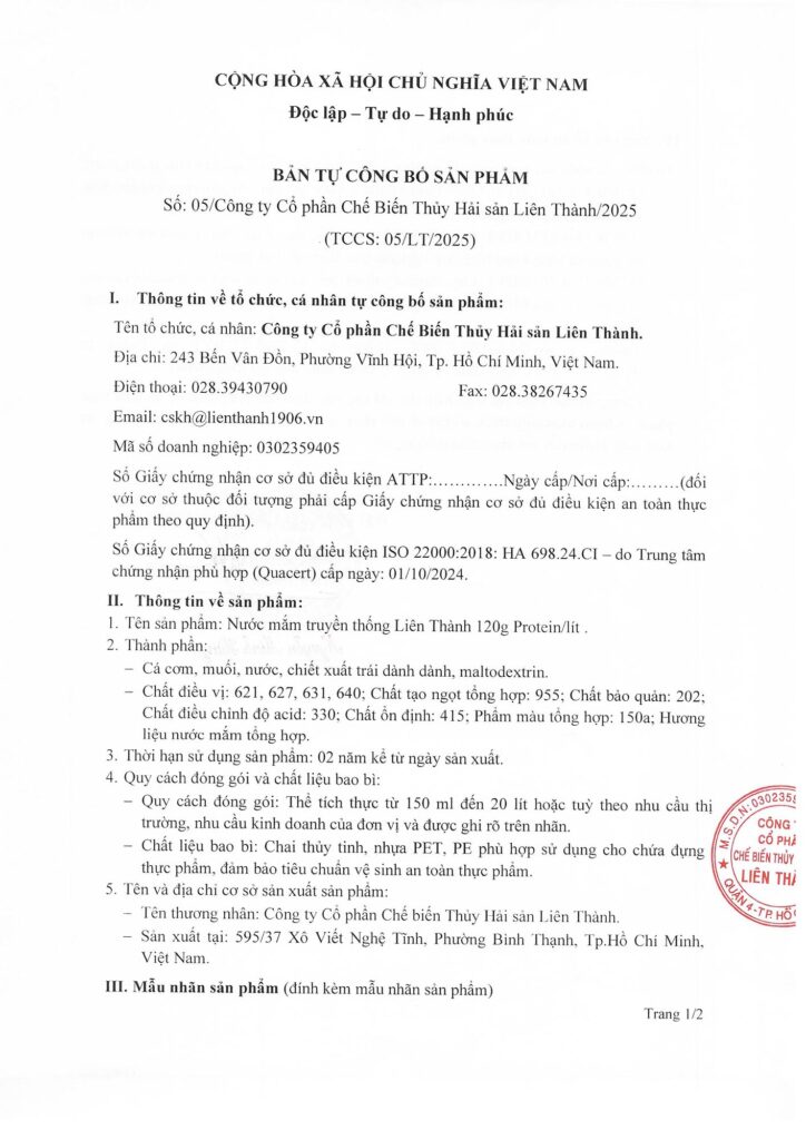 Bài trước Bài sau Bản tự công bố sản phẩm Nước mắm truyền thống Liên Thành 120gr Protein/lít lienthanh 23 September, 2025 9:49 am Các tin tức liên quan Bản tự công bố sản phẩm Nước mắm Liên Thành Nhất Vị (11/2025) Xem thêm » 26 November, 2025 Bản tự công bố sản phẩm Nước mắm chay Liên Thành Hương Nấm (11/2025) Xem thêm » 26 November, 2025 Bản tự công bố sản phẩm Nước mắm Liên Thành Nhất Vị Xem thêm » 13 November, 2025 Thông báo cập nhật địa chỉ trên tự công bố và nhãn sản phẩm (11/2025) Xem thêm » 5 November, 2025 Thông báo cập nhật thông tin địa chỉ trên tự công bố và nhãn Nước mắm truyền thống Liên Thành Nhãn Đỏ Xem thêm » 13 October, 2025 Thông báo bổ sung thiết kế nhãn sản phẩm Nước mắm cao đạm Liên Thành Nhãn Ngọc Xem thêm » 13 October, 2025