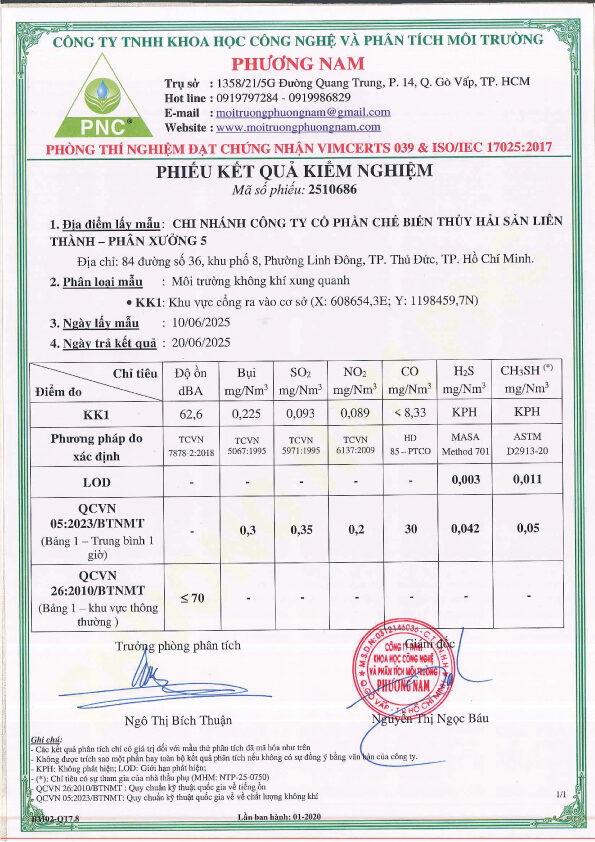 KẾT QUẢ KIỂM NGHIỆM MÔI TRƯỜNG KHÔNG KHÍ (THÁNG 6/2025) CHI NHÁNH CÔNG TY CỔ PHẦN CHẾ BIẾN THỦY HẢI SẢN LIÊN THÀNH – PHÂN XƯỞNG 5 11 September, 2025
