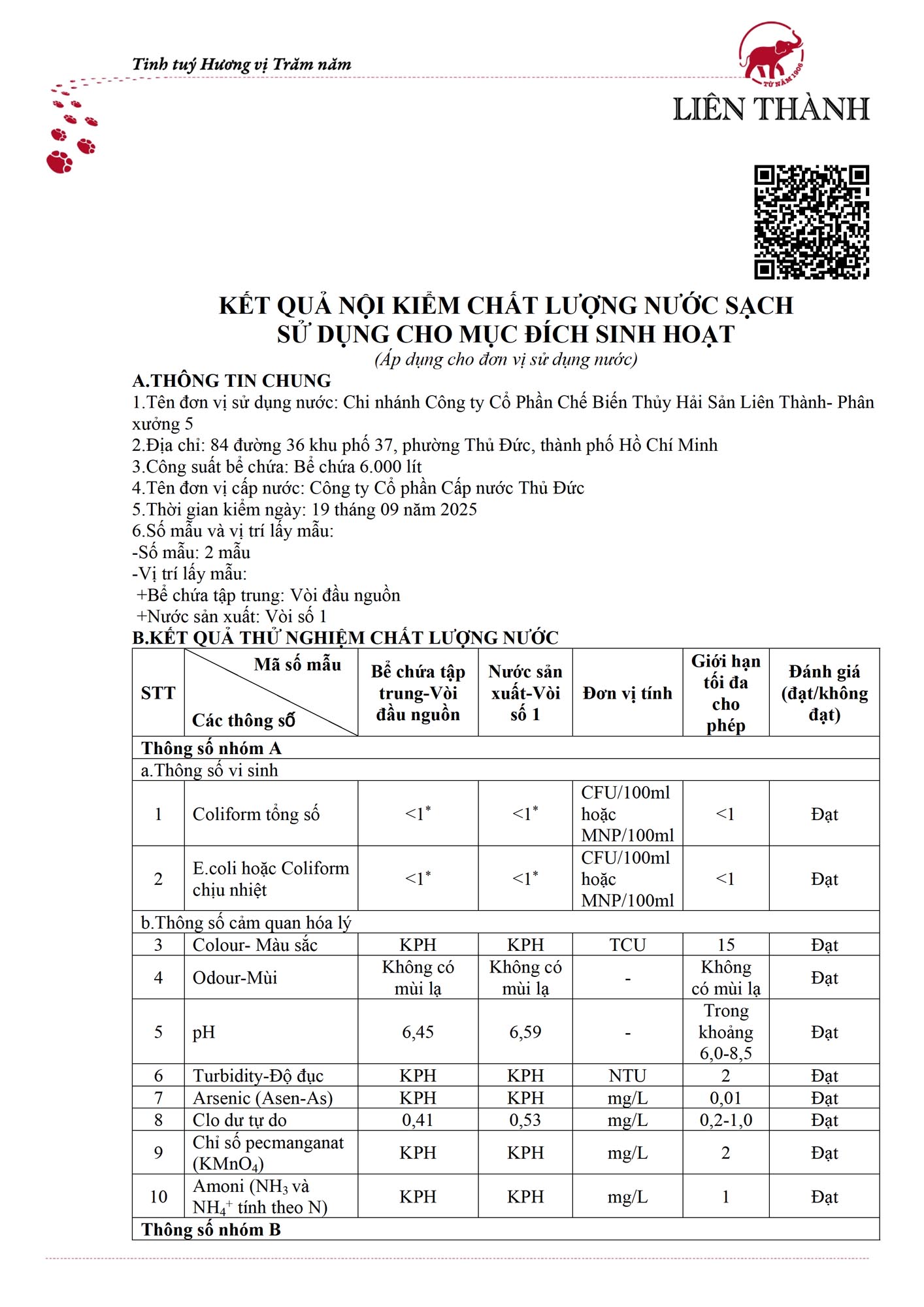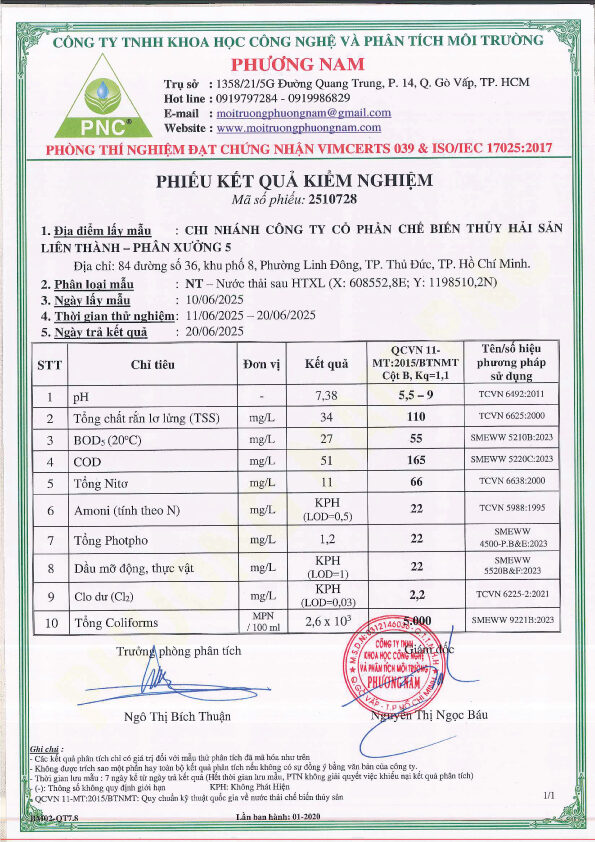 KẾT QUẢ KIỂM NGHIỆM NƯỚC THẢI (THÁNG 6/2025) CHI NHÁNH CÔNG TY CỔ PHẦN CHẾ BIẾN THỦY HẢI SẢN LIÊN THÀNH – PHÂN XƯỞNG 5 11 September, 2025