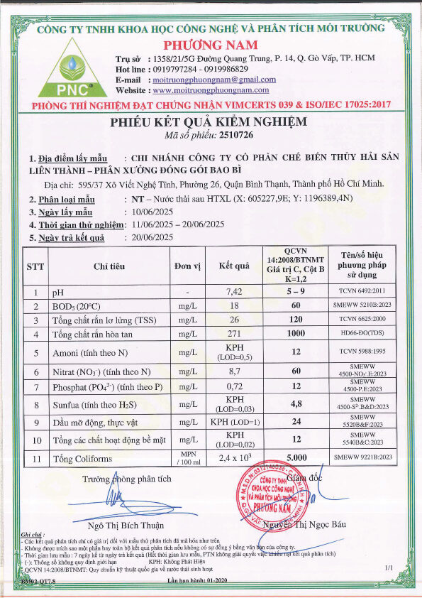 KẾT QUẢ KIỂM NGHIỆM NƯỚC THẢI (THÁNG 6/2025) CHI NHÁNH CÔNG TY CỔ PHẦN CHẾ BIẾN THỦY HẢI SẢN LIÊN THÀNH – PHÂN XƯỞNG BAO BÌ 11 September, 2025