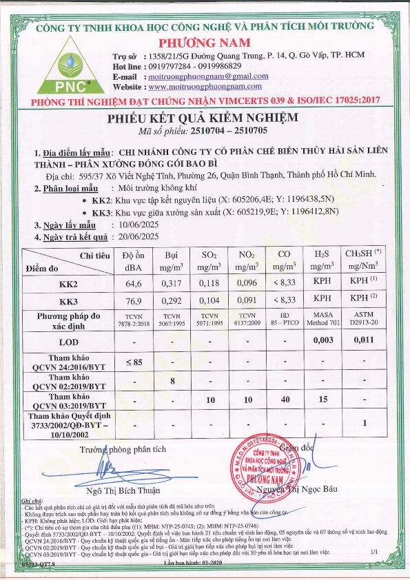 KẾT QUẢ KIỂM NGHIỆM MÔI TRƯỜNG KHÔNG KHÍ (THÁNG 6/2025) CHI NHÁNH CÔNG TY CỔ PHẦN CHẾ BIẾN THỦY HẢI SẢN LIÊN THÀNH – PHÂN XƯỞNG BAO BÌ 11 September, 2025