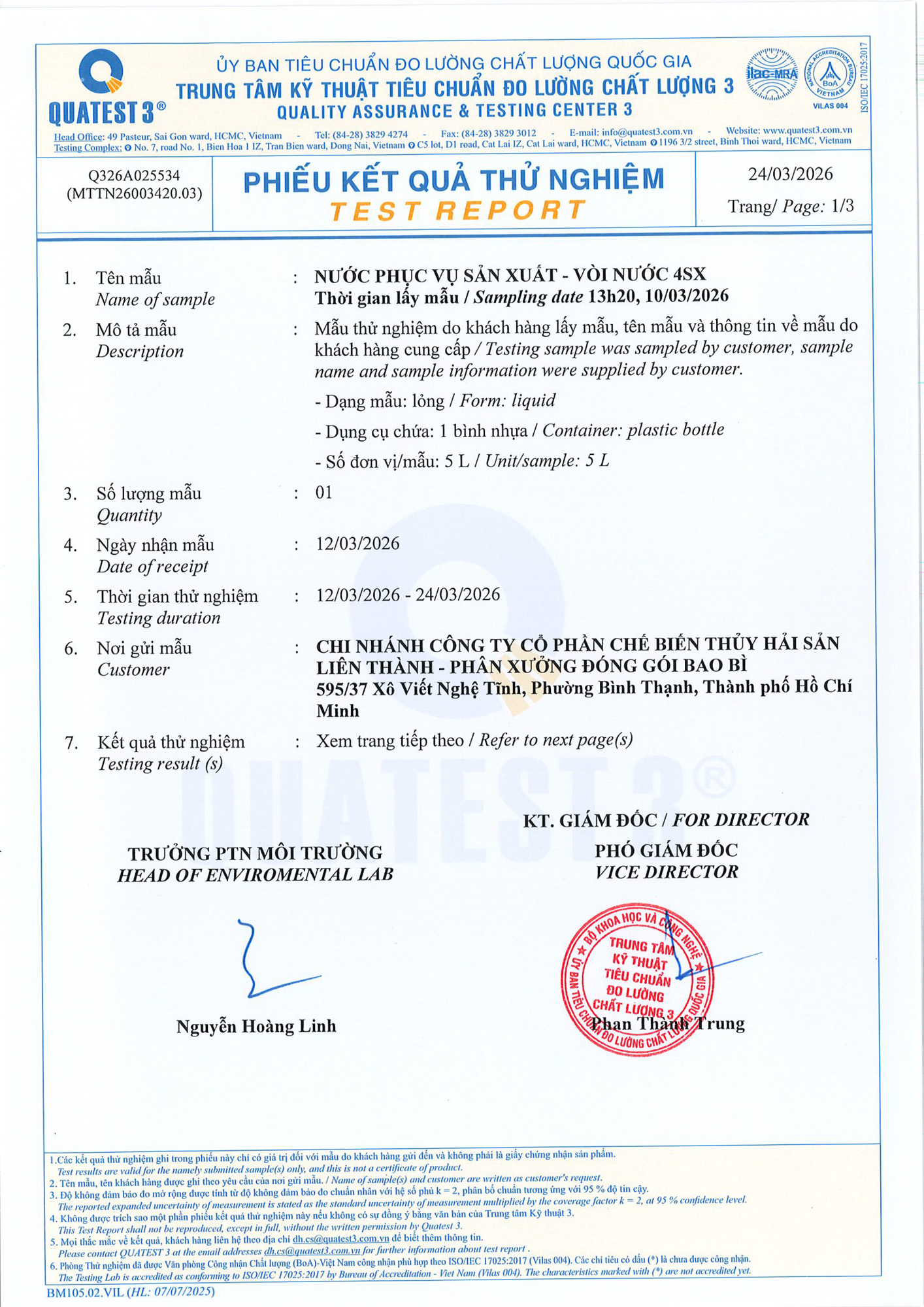KẾT QUẢ KHẢO SÁT ĐO ĐẠC MÔI TRƯỜNG CHI NHÁNH CÔNG TY CỔ PHẦN CHẾ BIẾN THỦY HẢI SẢN LIÊN THÀNH- PHÂN XƯỞNG BAO BÌ 26 July, 202413 October, 2023