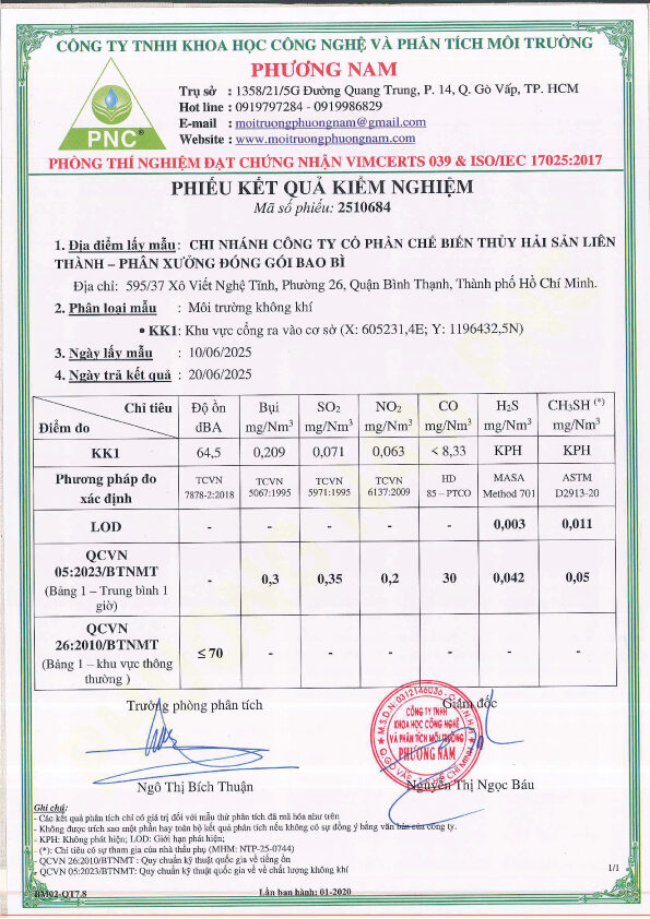 KẾT QUẢ KIỂM NGHIỆM MÔI TRƯỜNG KHÔNG KHÍ (THÁNG 6/2025) CHI NHÁNH CÔNG TY CỔ PHẦN CHẾ BIẾN THỦY HẢI SẢN LIÊN THÀNH – PHÂN XƯỞNG BAO BÌ
