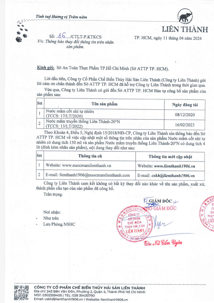 Thông báo cập nhật thông tin địa chỉ trên tự công bố và nhãn Nước mắm truyền thống Liên Thành Nhãn Đỏ