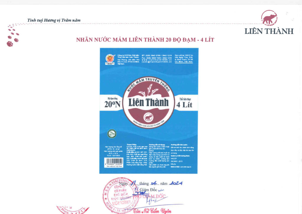 Thông báo thay đổi thông tin trên nhãn sản phẩm Nước Mắm Cốt Nhỉ Tự Nhiên và Nước Mắm Truyền Thống Liên Thành 20 độ đạm