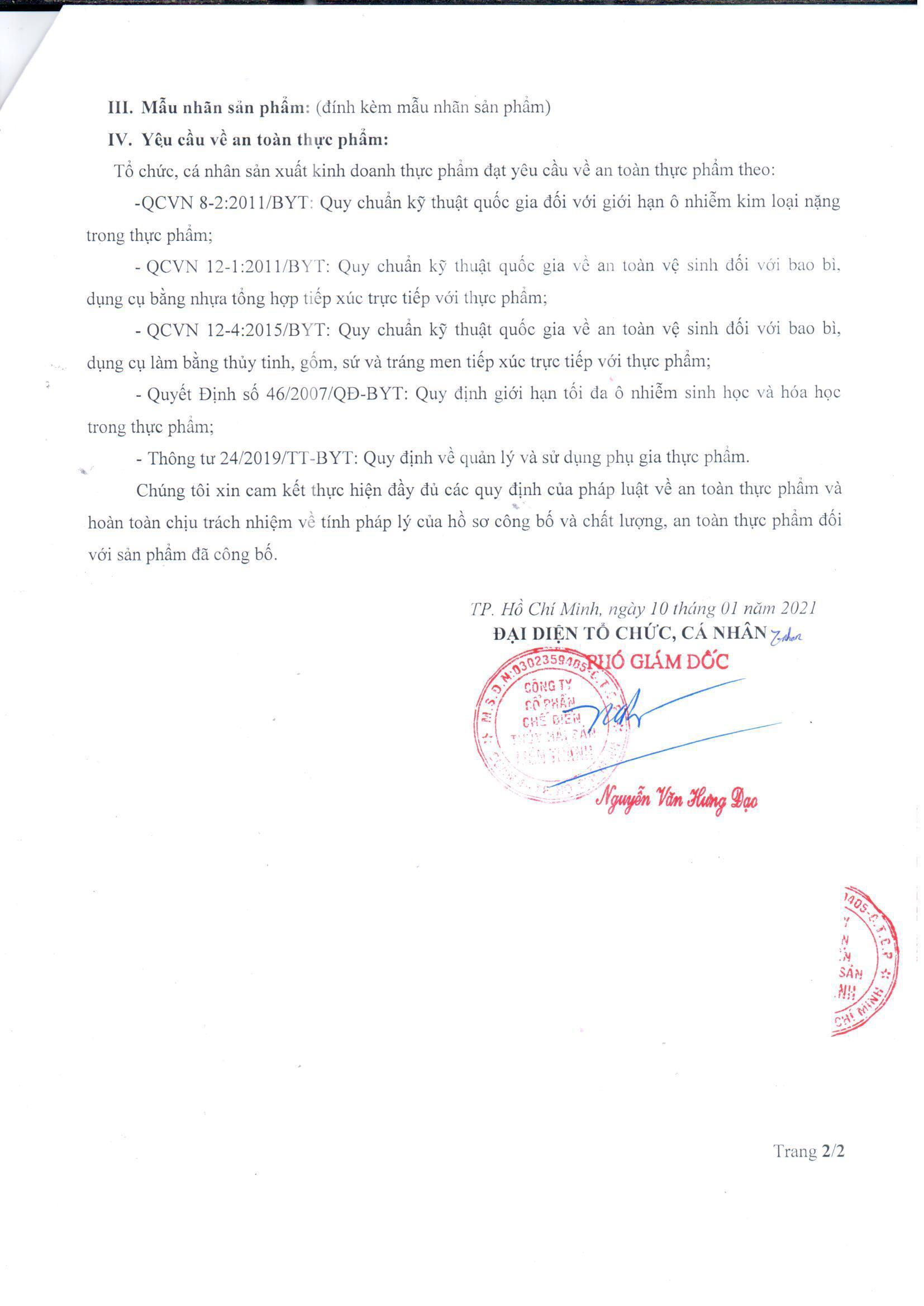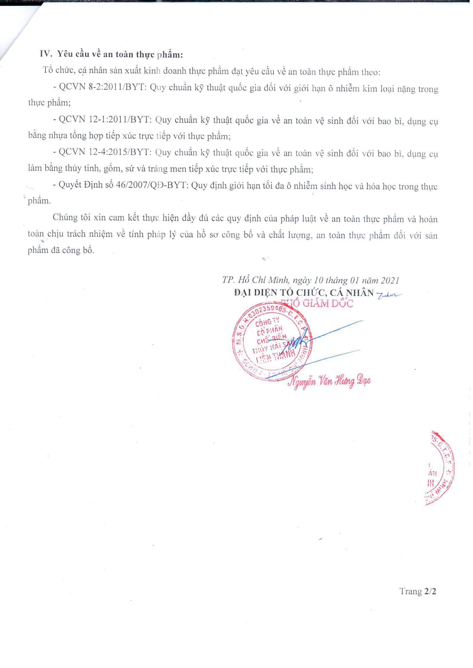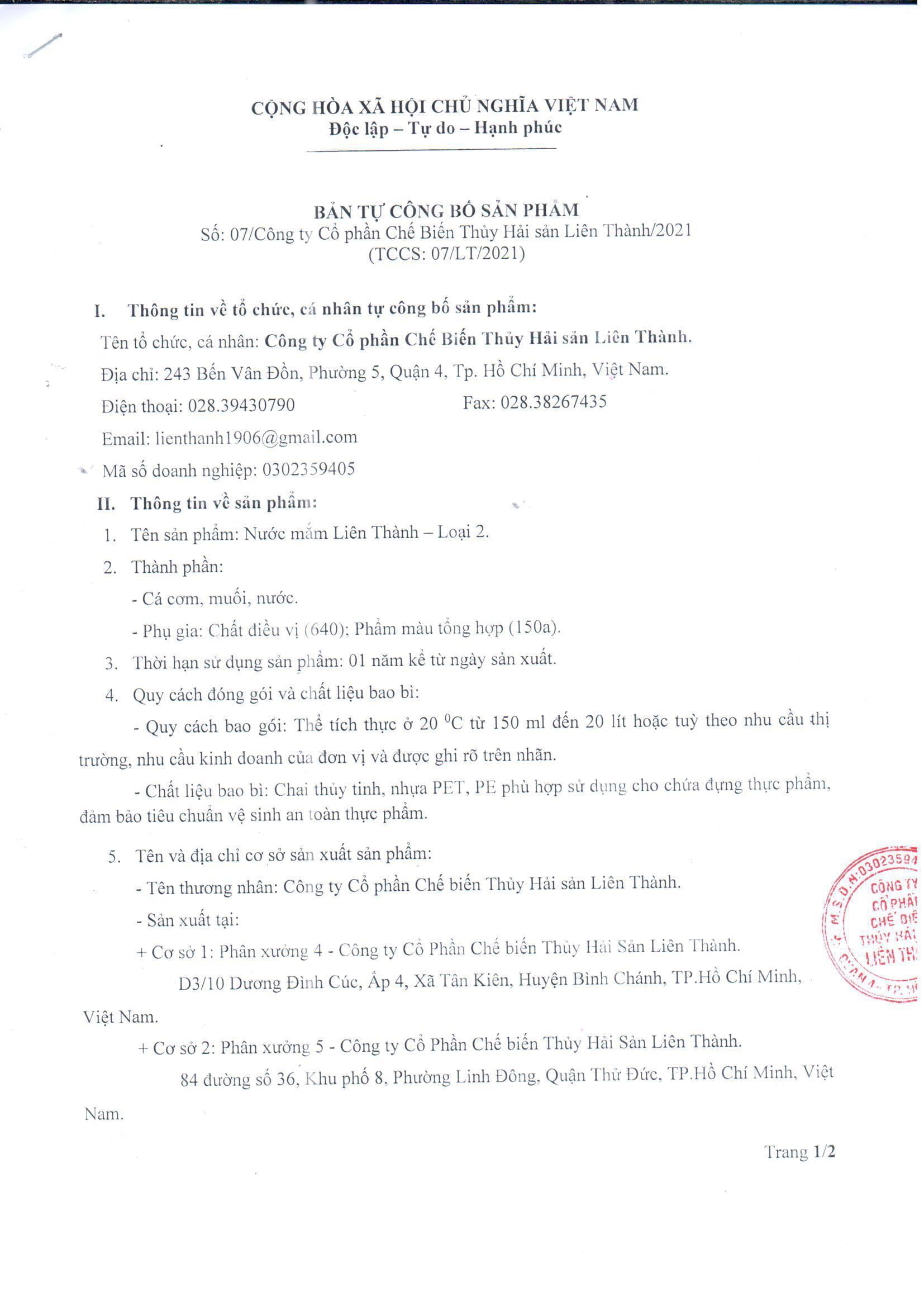 BẢN TỰ CÔNG BỐ NƯỚC MẮM NGUYÊN CHẤT LIÊN THÀNH_LOẠI ĐẶC BIỆT_TCCS: 01/LT/2021
